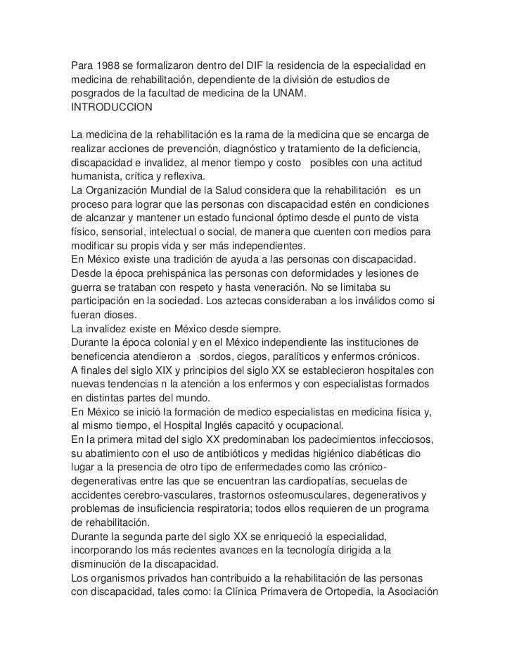 2. Para 1988 se formalizaron dentro del DIF la residencia de la especialidad en medicina de rehabilitación, dependiente de la división de estudios de posgrados de la facultad de medicina de la UNAM. INTRODUCCIÓN